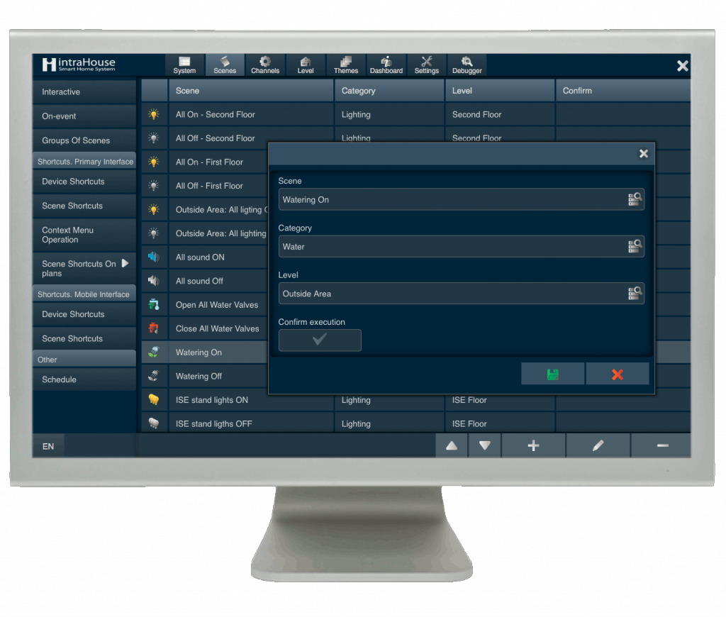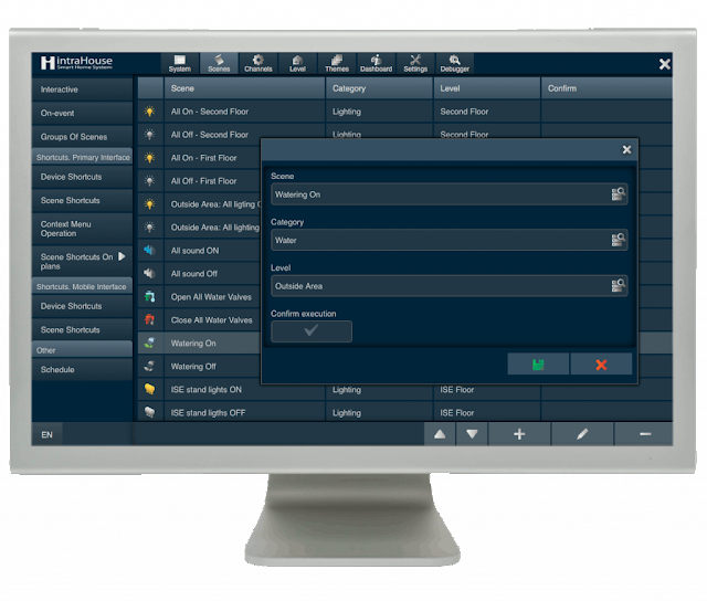 In intraHouse system, the concept of Scene has a broader meaning: it means management of all devices in accordance with particular algorithms.