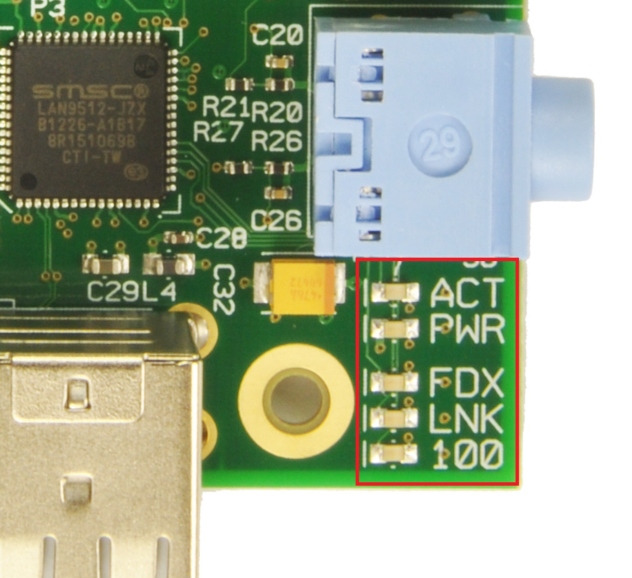 There are 5 status LED's on the Raspberry Pi board namely [OK, PWR, FDX, LNK, 10M]. FDX, LNK, 10M are connected to the LAN IC- LAN9512. So those 3 LED's will be present only on model B.